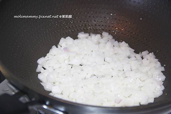 Step1:鍋中倒入 1 大匙油燒熱,將蒜末下鍋炒香,再放入洋蔥丁炒至透明